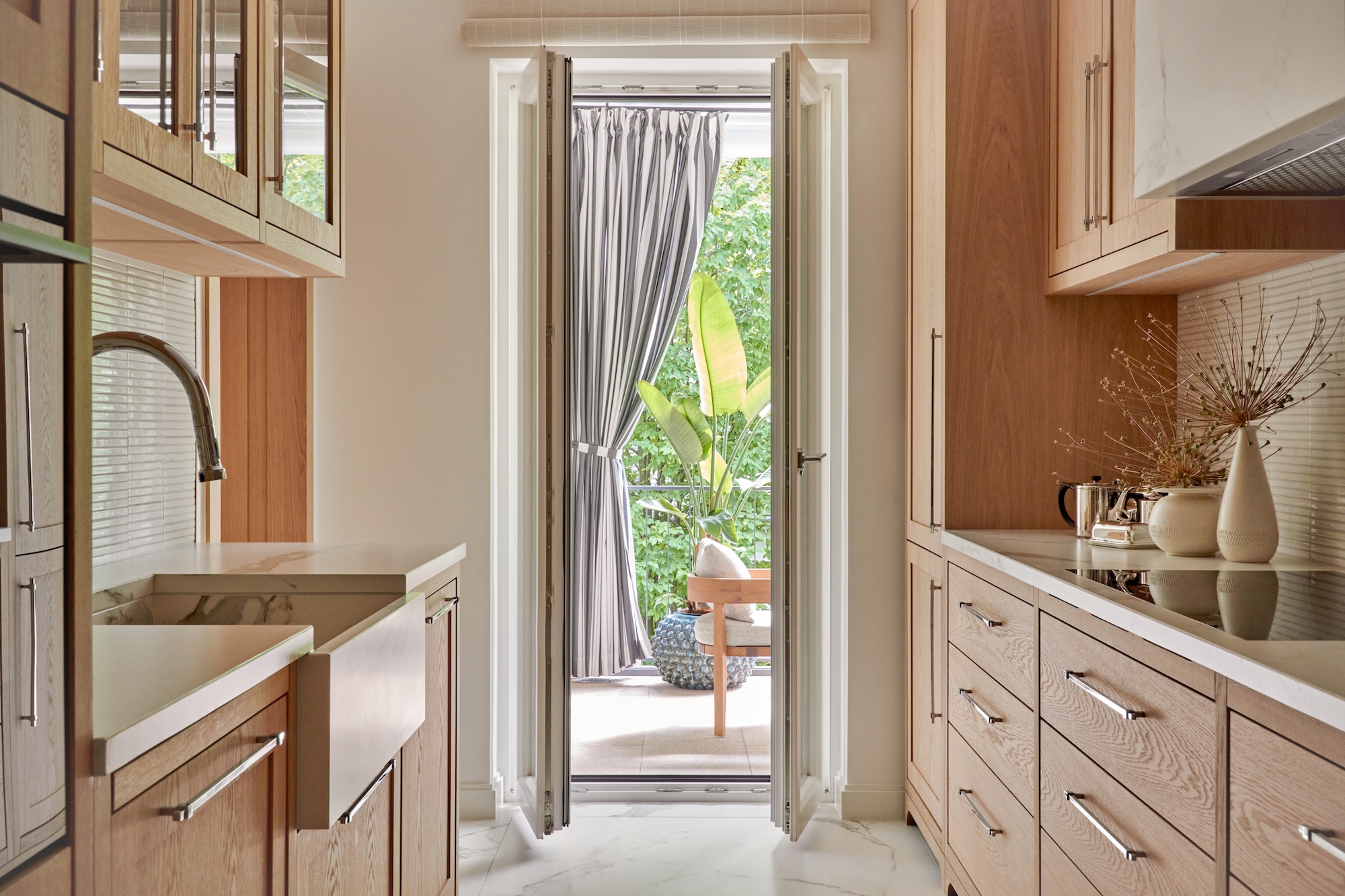 Die Küche aus gebürstetem Eichenholz erhält mit Stabfliesen auf der Rückseite eine subtile Struktur. Im Wohnbereich zoniert ein verstellbarer Raumtrenner mit Lamellen den offenen Grundriss, ohne ihm die Großzügigkeit zu nehmen.